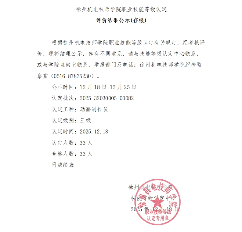 徐州机电技师学院技能等级认定82批次结果公示