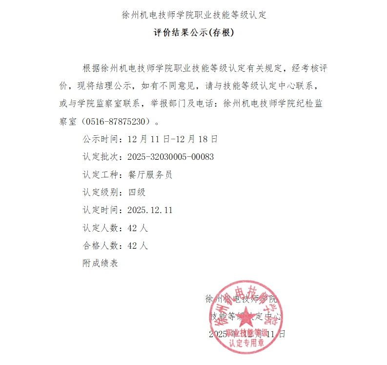 徐州机电技师学院技能等级认定83批次结果公示
