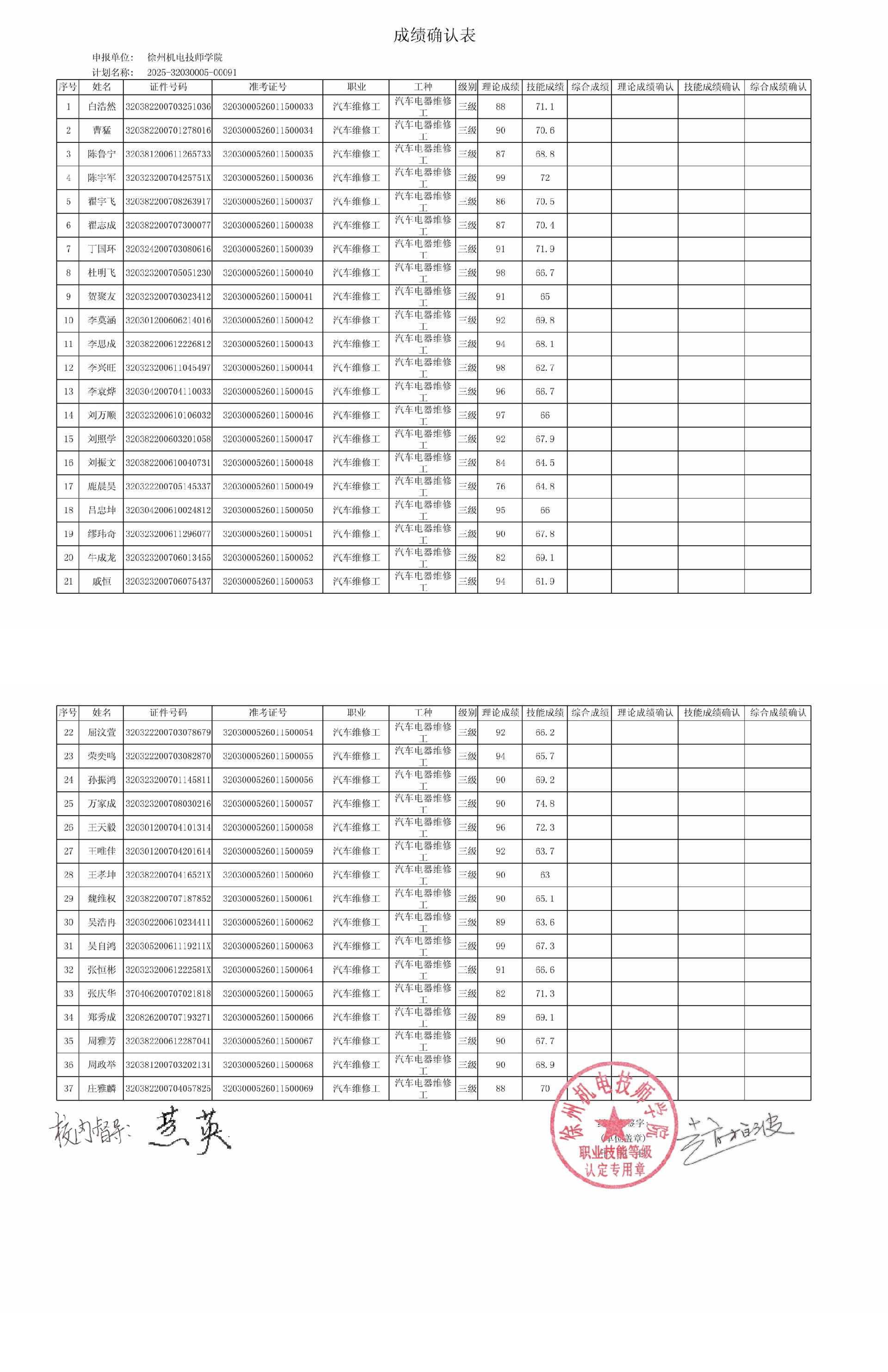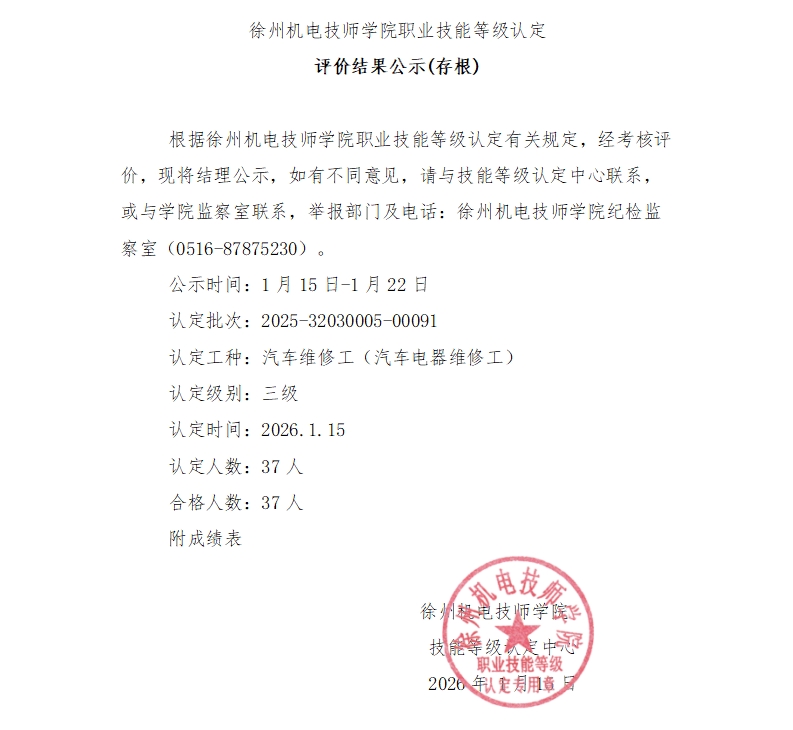徐州机电技师学院技能等级认定91批次结果公示