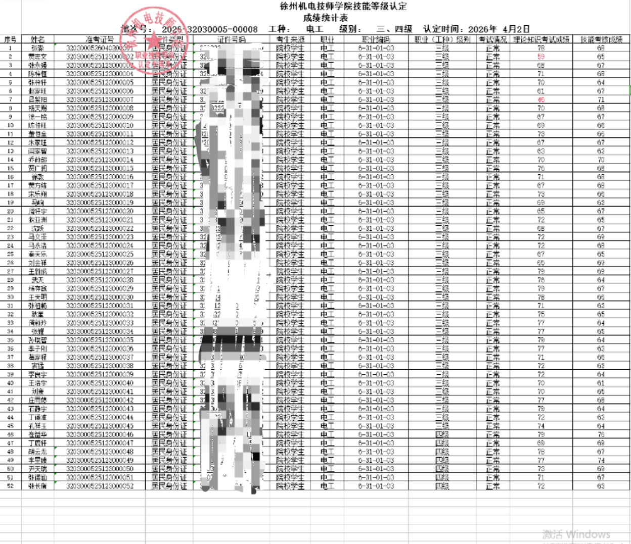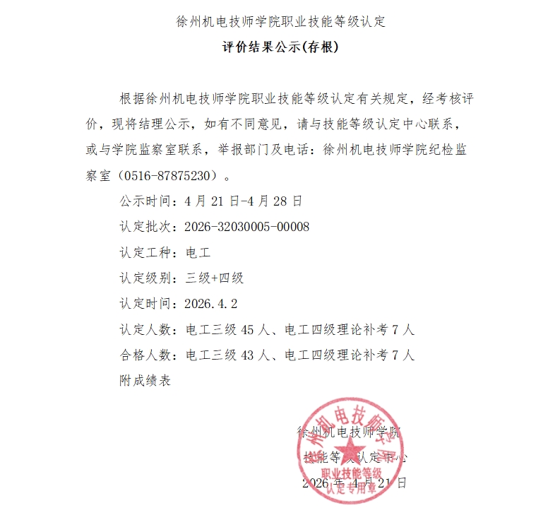 徐州机电技师学院技能等级认定2026-8批次成绩公示