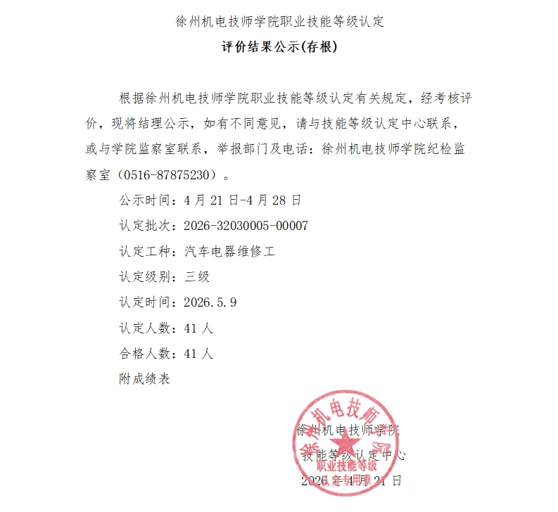 【上一篇】徐州机电技师学院技能等级认定2026-7批次公告