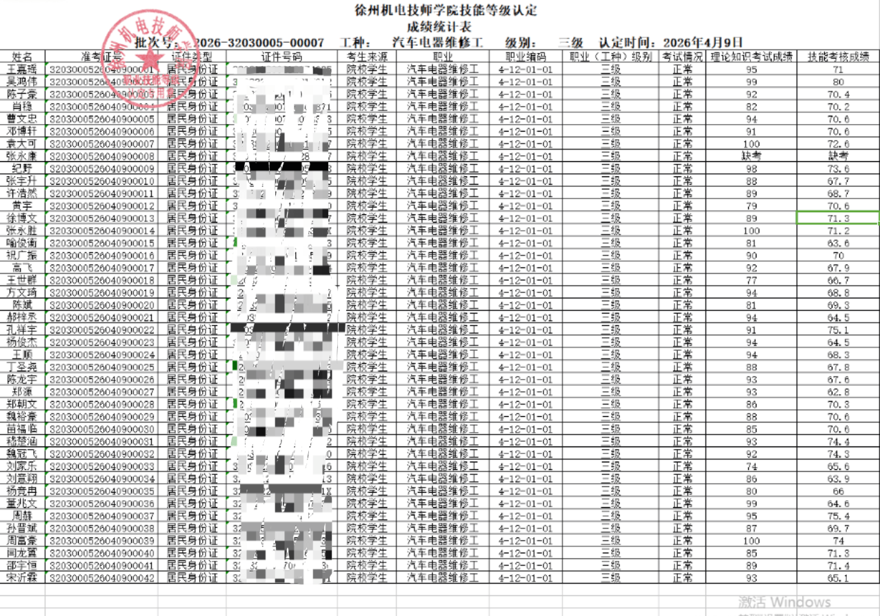 徐州机电技师学院技能等级认定2026-7批次成绩公示