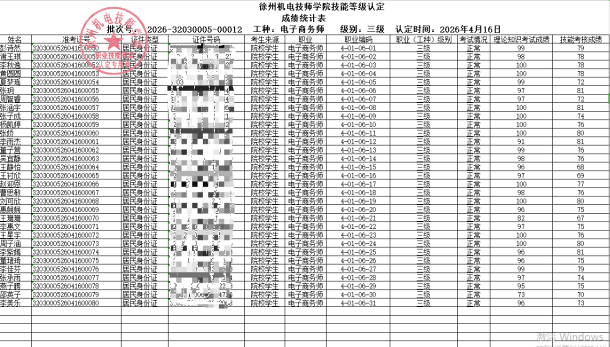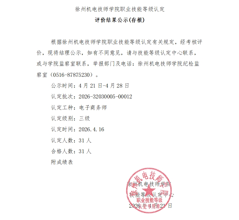 徐州机电技师学院技能等级认定2026-12批次成绩公示