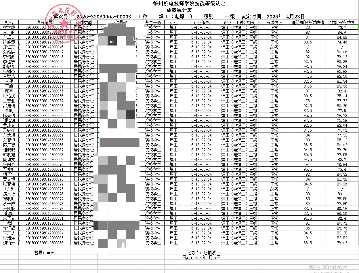 徐州机电技师学院技能等级认定2026-3批次成绩