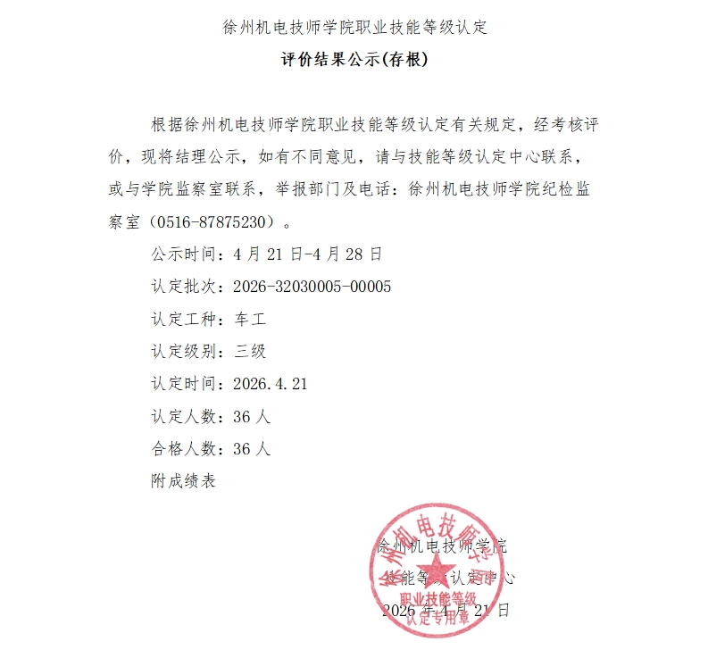 徐州机电技师学院技能等级认定2026-5批次成绩公示