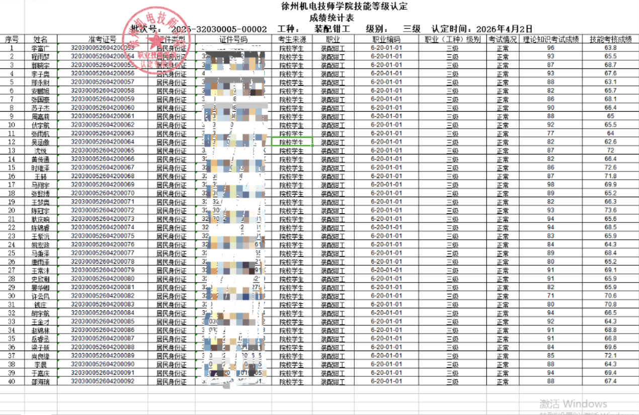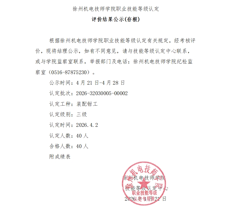 徐州机电技师学院技能等级认定2026-2批次成绩公示