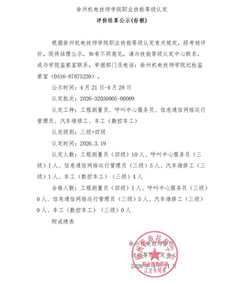徐州机电技师学院技能等级认定2026-9批次成绩公示